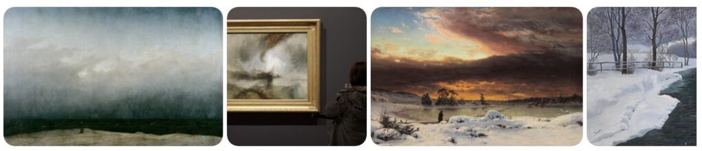 Few artists captured this better than Caspar David Friedrich. His winter landscapes are vast and spare, often featuring a solitary figure facing the horizon. The emotional charge lies not in action, but in contemplation.